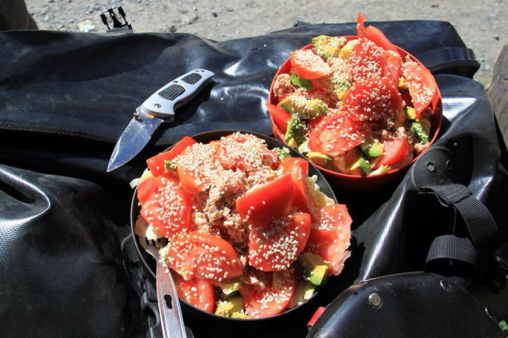 Io e Pier ci conosciamo da qualche anno ormai e una delle cose che abbiamo in comune, è assolutamente il piacere godereccio per il cibo, il buon cibo. Nessuno dei due si nega mai a primi piatti abbondanti, succose carni alla brace, pesce, vino, verdure in tutte le salse, pizza, e sopratutto gelati, gelati, gelati. Due abbastanza golosi direi. Mentre ci alleniamo tra Milano, Bergamo, la Martesana che va da Milano a Lecco, la ciclabile fino al lago di Garda e altro ancora, non introduciamo grandi cambiamenti nella nostra alimentazione; forse, l’unico vero cambiamento è l’incremento in quantità, per altro non giustificato dal sforzo atletico (in fondo entrambi abbiamo sempre fatto sport per tenerci in forma) bensì dalla gola e dalla voglia di ricompensa per "l’eroico atto" compiuto. Poi partiamo e la casualità non casuale (perché come dice il mio amico James Redfield nei suoi meravigliosi libri, tra i quali spicca, la "Profezia di Celestino", niente e nessuno che incrocia la tua strada, lo fa per caso; tutto ha un motivo, una ragione, un significato; a te rimanere sveglio, all’erta, connesso, per capirne il vero motivo) è che la prima coppia di Warmshower che ci ospita in quel di Buenos Aires, Lautaro e Mai, sono due ciclo-turisti accaniti, nonché due atleti instancabili. Passiamo i nostri primi quattro giorni in Argentina, ospiti a casa loro e tra i tanti suggerimenti che ci danno (due profani come noi, sono spugne assorbenti in ascolto di Lautaro e Mai), ci suggeriscono come dovremmo preferibilmente alimentarci. Lautaro ci spiega che il dispendio energetico sarà enorme soprattutto quando cominceremo a salire le Ande, e che avremo fame, molta fame, sempre fame; sorridendo ci dice che ogni occasione sarà buona per mangiare e che dovremo soprattutto stare attenti ad alimentarci bene. Cosa vuol dire "bene"? Vuol dire alimentare bene i muscoli, per evitare che, non trovando i loro nutrenti adatti, ovvero le proteine, vadano ad intaccare le risorse di grassi e zuccheri fondamentali per sopravvivere e non debilitarsi nel lungo periodo. Lautaro ci fa presente inoltre che, per chi viaggia in una terra immensa, sperduta, estrema e scarsamente popolata come l’Argentina, è facile che spesso non si arrivi entro sera in un paesino e/o città dove entrare in un negozio e comprarsi gli ingredienti per una ricca cena; questo fa si che ci si debba accontentare di un semplice piatto di pasta con un filo d’olio o di un brodino caldo o peggio di una scatoletta di carne in poltiglia che loro chiamano "picadillo de carne" (per me immangiabile …). Ovvio, non si tratta di resistere a condizioni di digiuno o de-nutrizione per giorni, però anche un giorno o una sera sola, di scarso potere nutrizionale dopo una lunga e faticosa pedalata, può incidere pesantemente sulle performance del giorno dopo. Non solo, a lungo andare, si potrebbe perdere la forza fisica nonché psicologica per poter continuare a godersi le pedalate in pace e tranquillità.