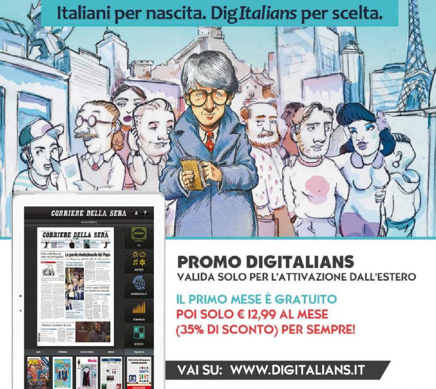 DigItalians (http://goo.gl/qEdlFi) è il nuovo servizio che il Corriere della Sera ha creato su misura per gli italiani che vivono all’estero e che non rinunciano ad informarsi su ciò che avviene in Italia. Con un insieme di informazioni, spiegazioni, interpretazioni, previsioni, commenti, numeri, immagini ed intrattenimento, il Corriere si rivolge a tutti gli italiani che risiedono oltreconfine.