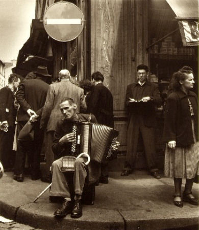 L’accordéoniste. E’ di lui che vorrei parlarvi. Di come il fotografo lo rappresenta all’interno della sua opera. Della luce che gli fa scivolare sul corpo, sulla fronte, sul viso spigoloso, segnato da forse troppe guerre e smagrito da troppo poco amore. Ripassando più volte al giorno per l’affollata piazzetta intorno alla quale si dispongono ambulanti, pittori e giocolieri, ho sempre la strana impressione di tornarlo a vedere, di riascoltare quelle note sfiatate. Dietro di lui una piccola folla di spettri si muove ancora, sussurrando, smaniando, e il giovane scrivano da marciapiede compila la sua pagina cercando di fermare i pensieri.
