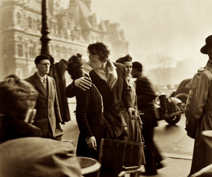 Potrei chiedervi di seguirmi fino all’Hôtel de Ville, davanti al quale due amanti giovani, ardenti, divenuti immortali nell’attimo in cui le loro labbra si sfiorano a sancire un addio si baciano nel brano fotografico più celebre di tutti i tempi. Ma non è questa la vicenda che stiamo inseguendo, né il luogo nel quale vorrei condurvi, invitandovi a raggiungermi nell’affollata rue Mouffetard che Doisneau ci restituisce in una delle sue foto più intense.