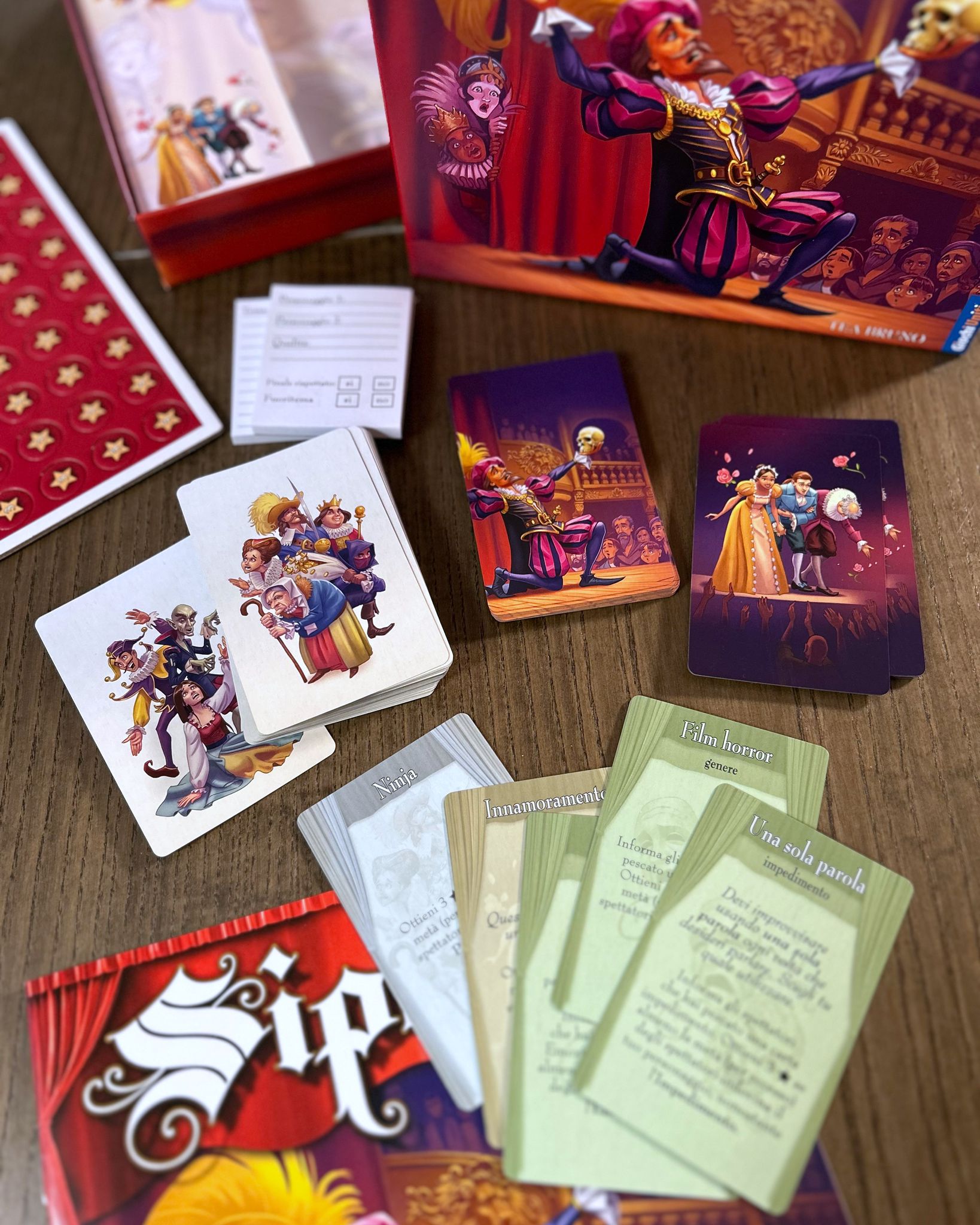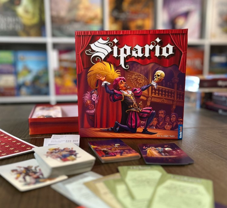 “Sipario” è un gioco da tavolo d’improvvisazione teatrale. Si definisce nello specifico un party game perché è quel tipico gioco adatto a un gruppo di amici allargato e chiassoso, infatti si gioca da 4 giocatori fino a 10-12.